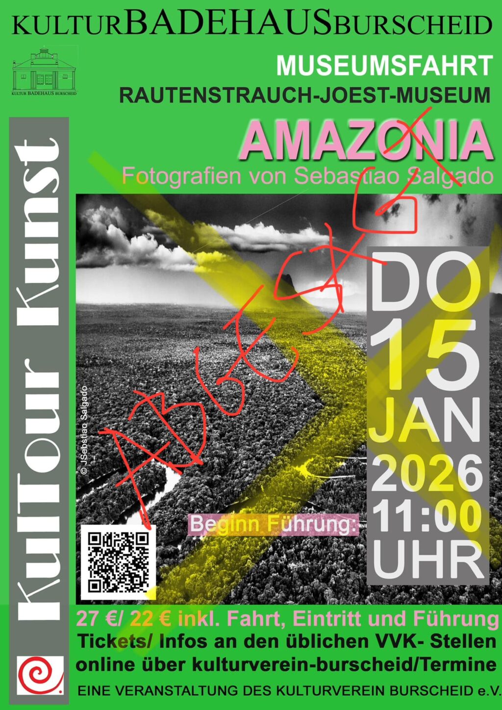 Absage KulTour: „Amazonia“ im Rautenstrauch-Joest Museum am 15. Januar 2026. Die für Donnerstag, den 15. Januar 2026, geplante Museumsfahrt KulTour des Kulturvereins Burscheid e.V. nach Köln in die Ausstellung „Amazonia“[…]