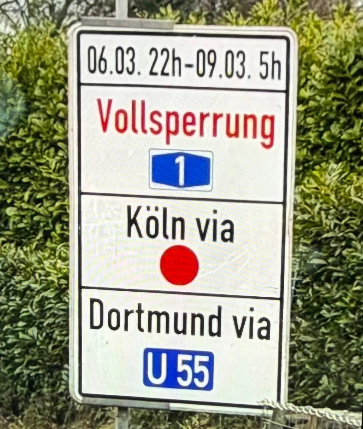 - Die A1 ist in beide Fahrtrichtungen zwischen den Anschlussstellen Wermelskirchen und Remscheid in beide Richtungen vollgesperrt. Umleitungen über die B51 sind mit rotem Punkt ausgeschildert.