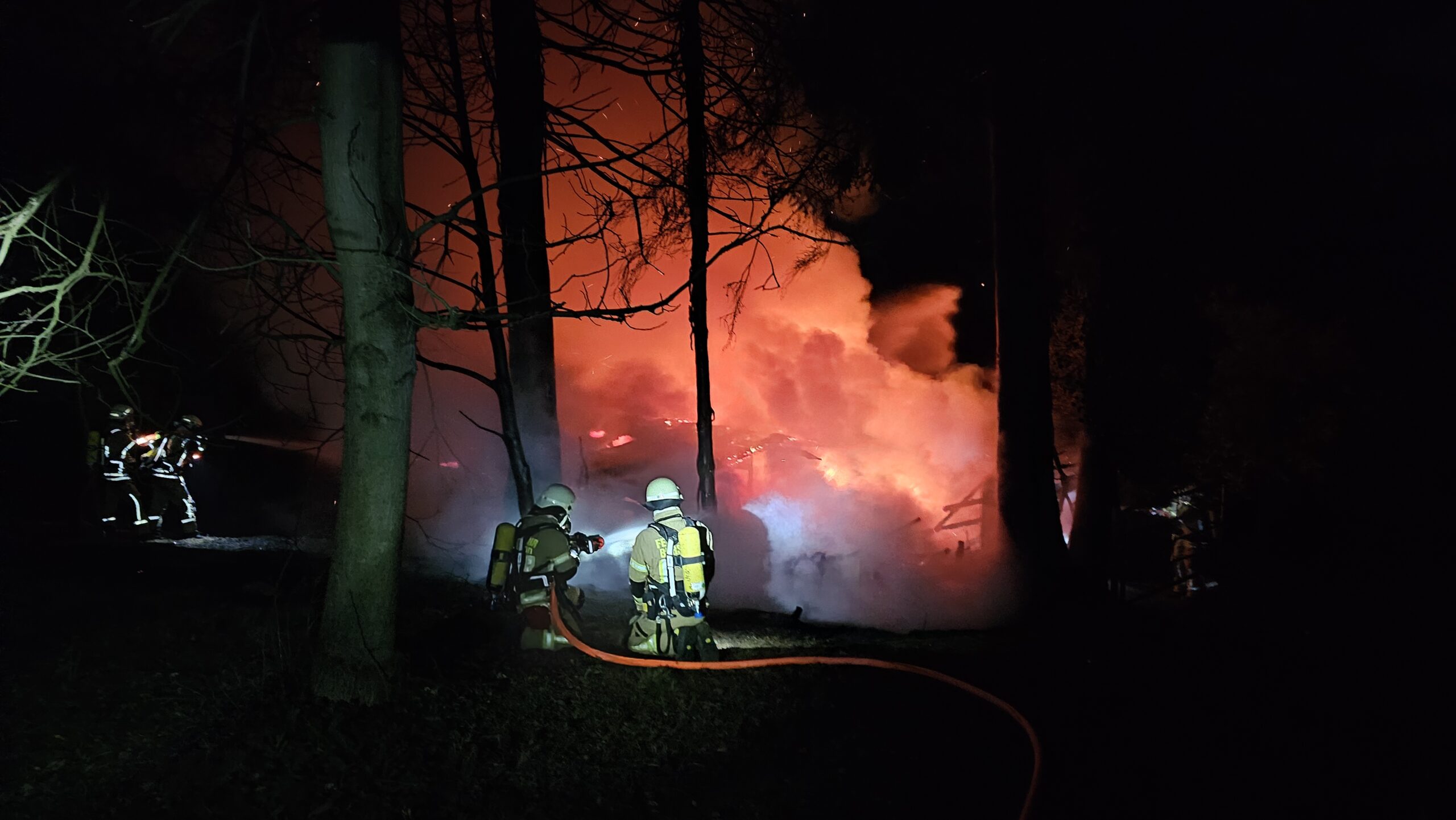 Zeitweise waren bis zu fünf C-Rohre gleichzeitig im Einsatz, um die Flammen unter Kontrolle zu bringen und eine weitere Ausbreitung des Brandes auf das Wohnhaus sowie die umliegende Vegetation zu verhindern.