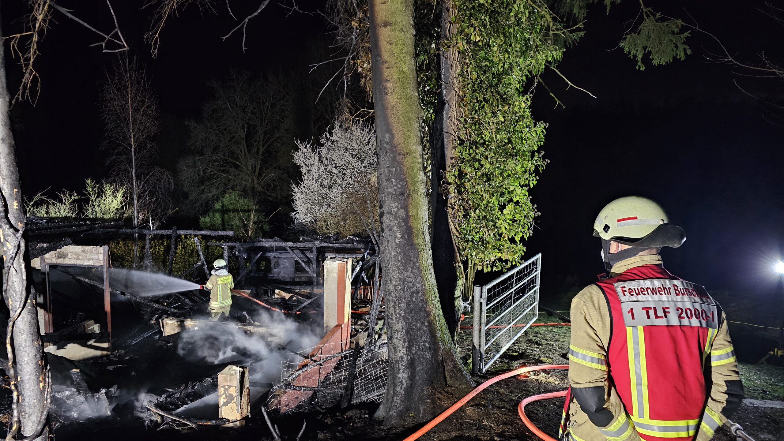 Die Wasserversorgung wurde über mehrere Hydranten sichergestellt, unter anderem auch über einen Hydranten entlang der B51. Insgesamt waren rund 45 Einsatzkräfte der Feuerwehr Burscheid im Einsatz. Der Schuppen wurde durch das Feuer vollständig zerstört. Eine Ausbreitung des Brandes auf das angrenzende Wohnhaus sowie auf umliegende Sträucher und Büsche konnte jedoch erfolgreich verhindert werden.