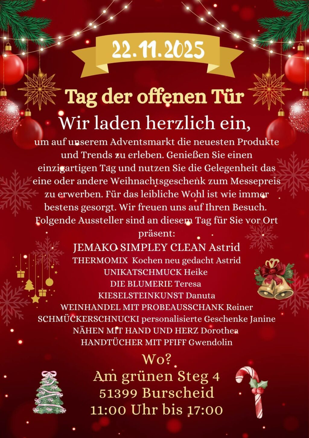 Burscheid - Adventsausstellung - Am grünen Steg in Hilgen am 22.11.25. Tag der offenen Tür Wir laden herzlich ein, um auf unserem Adventsmarkt die neuesten Produkte und Trends zu erleben. Genießen Sie einen einzigartigen Tag und nutzen Sie die Gelegenheit das eine oder andere Weihnachtsgeschenk zum Messepreis zu erwerben. Für das leibliche Wohl ist wie […]