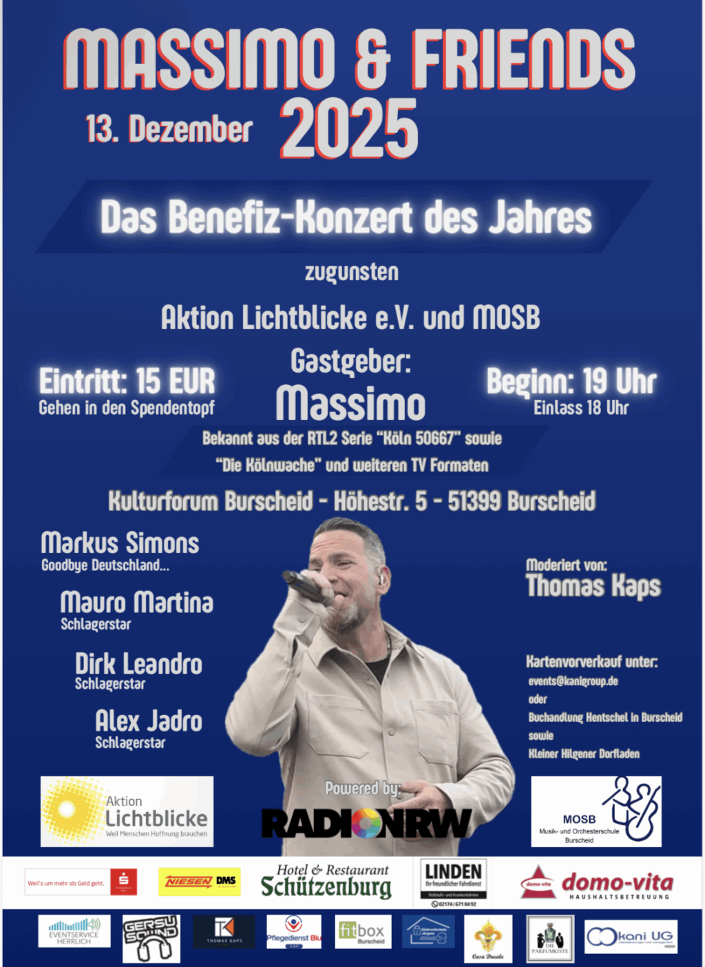 Burscheid - Benefizevent Massimo and Friends am 13.12.25. Das Benefizkonzert zugunsten der Aktion Lichtblicke und der Musik- und Orchesterschule Burscheid Der Gast- und Namensgeber Massimo Nigordi, u.a. bekannt aus der RTL2 Serie „Köln 50667“ empfängt am 13. Dezember erneut sein Publikum zum mittlerweile achten Benefizkonzert „Massimo & Friends“. Wie in jedem Jahr stehen befreundete Künstler […]