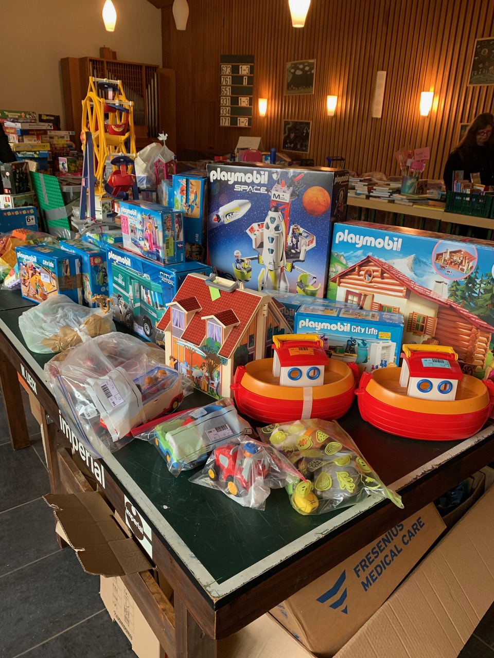 Ein großes Team aus mehr als 100 engagierten Freiwilligen bereitet den Basar vor, denn im Verkauf liegen Kleidung, Spielzeug und Bücher nach Größen und Themen sortiert aus. So finden Familien schnell, was sie brauchen – von Babybodys bis zum Playmobil-Schloss. Das Team der Cafeteria bietet leckere Waffeln an.