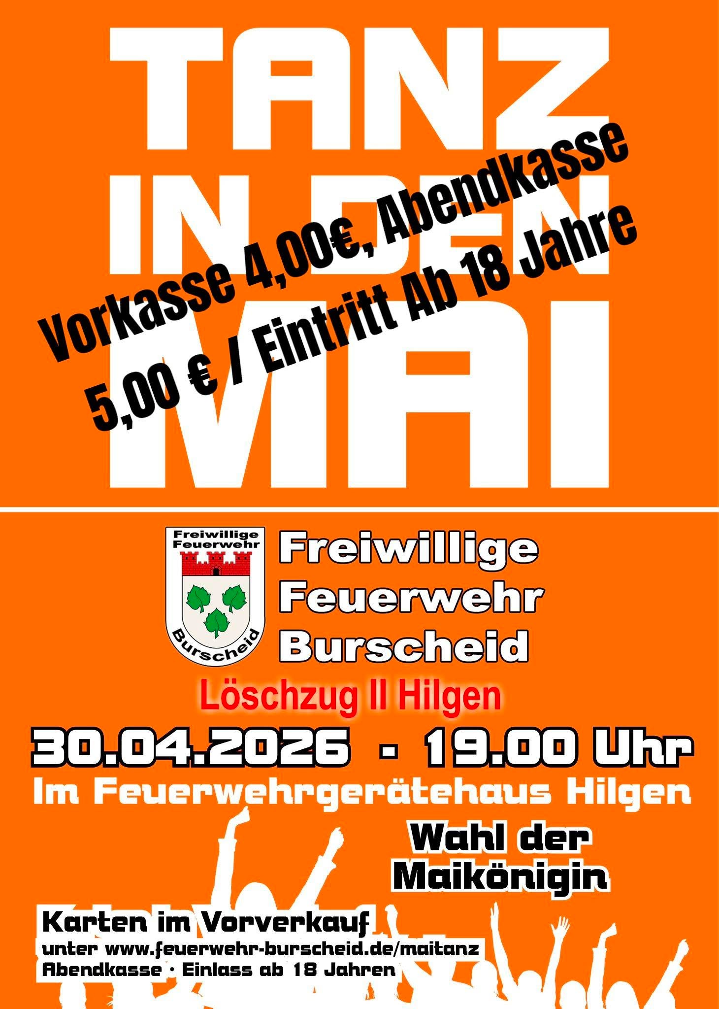 Eintritt Vorverkauf:   4€ pro Person – hier der Link: https://www.feuerwehr-burscheid.de/einheiten/loeschzug-hilgen/maitanz/karten-maitanz