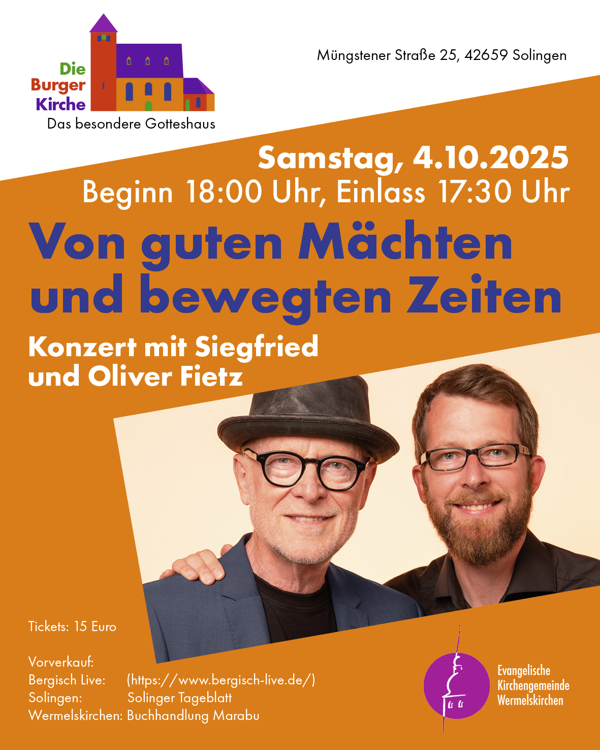 Am 4. Oktober gastiert Siegfried Fietz in der Burger Kirche. Der mit der Musik zu „Von guten Mächten wunderbar geborgen“ – dem berühmten Gedicht von Dietrich Bonhoeffer – bekannt gewordene Liedermacher kombiniert christliche Texte mit eingängigen Melodien. Siegfried Fietz ist ausgebildeter Organist und spielt auch Geige und Gitarre. Begleitet wird er an diesem Abend von seinem Sohn Oliver, der ebenfalls eigene Lieder komponiert hat – darunter Weihnachtsmusicals. Mit ihrer Musik vermitteln Vater und Sohn Fietz den Mut, auch und gerade in herausfordernden Zeiten dem Alltag seine schönen Momente abzugewinnen.