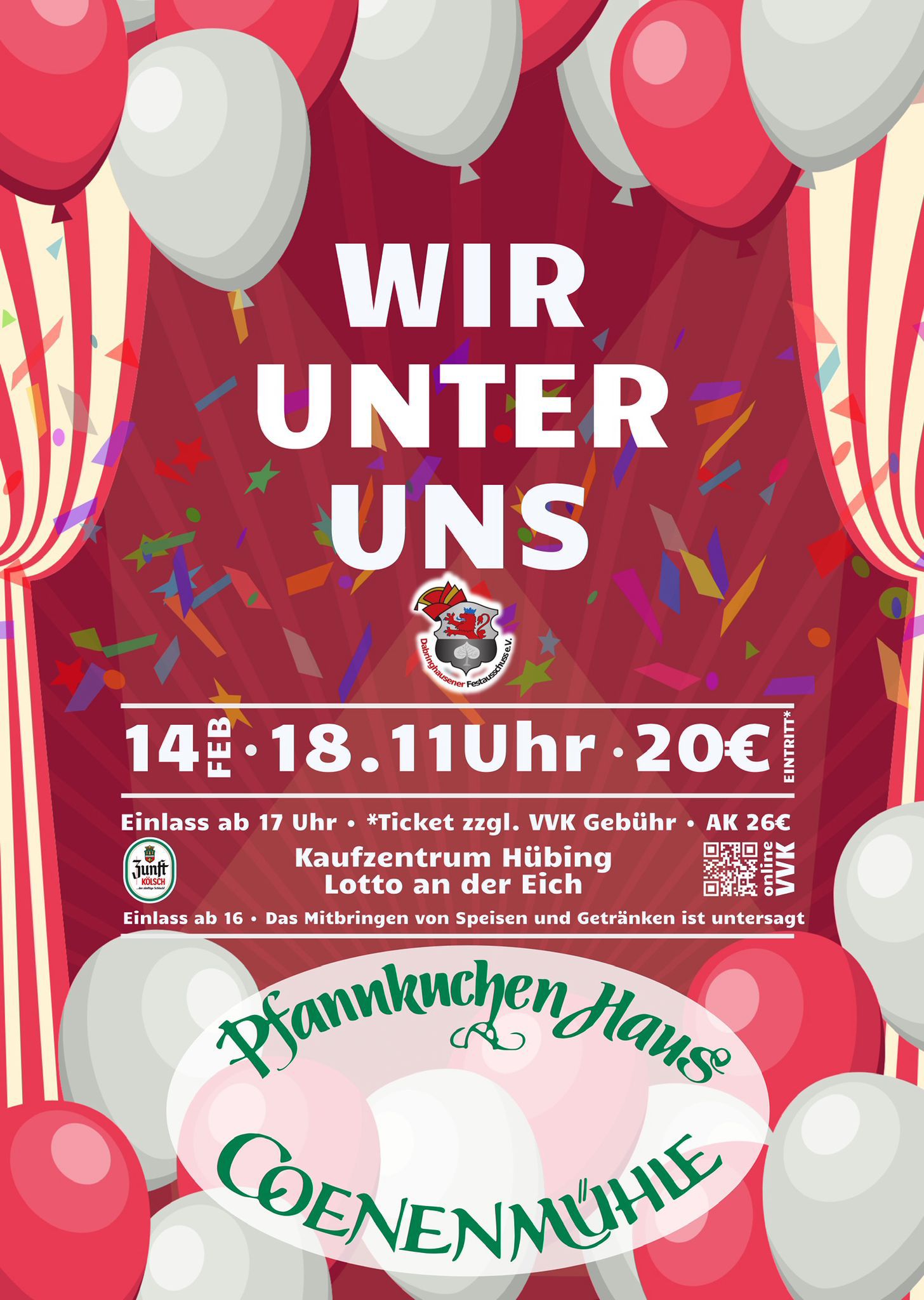 „Wir unter uns“ der bekannte Höhepunkt im Dabringhausener Karneval werden am 14.02.2026 die einheimischen Gruppen und das Dawerkuser Dreigestirn in einem etwa 4-stündigen Bühnenprogramm die Jecken wieder begeistern. Wir bringen die Mehrzweckhalle Dabringhausen endlich wieder zum beben!