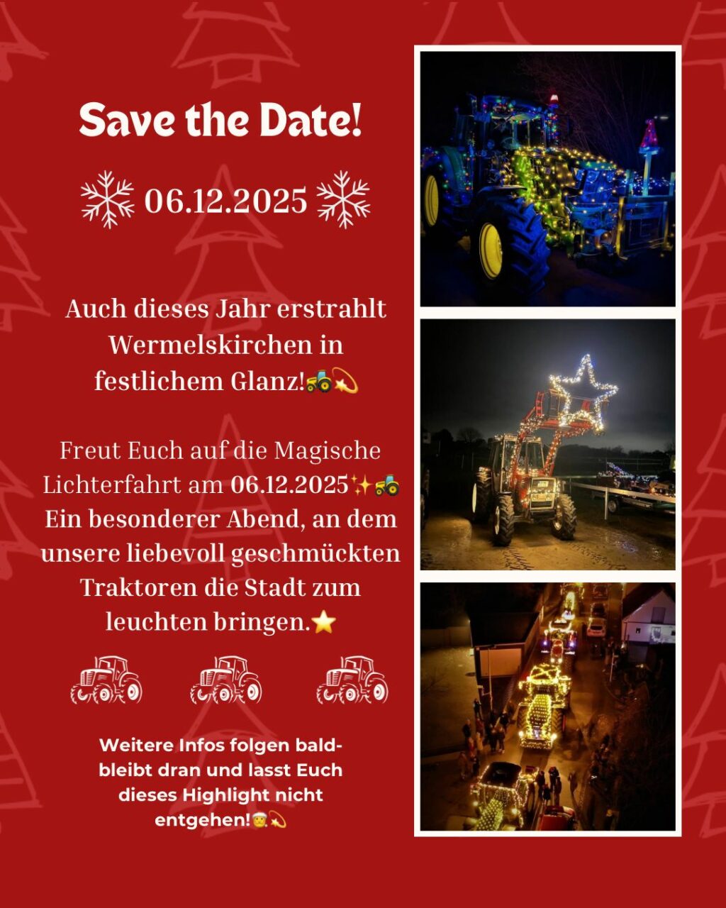 Wermelskirchen - Lichterfahrt am 06.12.25 ab 17 Uhr. Save the Date! 06.12.2025 Auch dieses Jahr erstrahlt Wermelskirchen in festlichem Glanz! Freut Euch auf die Magische Lichterfahrt am 06.12.20256 Ein besonderer Abend, an dem unsere liebevoll geschmückten Traktoren die Stadt zum leuchten bringen.