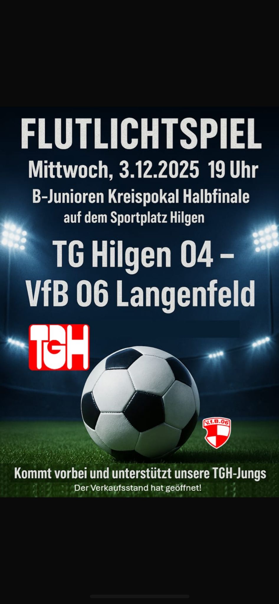 Burscheid - Flutlichtspiel der TG Hilgen 04 - VfB 06 Langenfeld am 03.12.25 um 19 Uhr. Kommenden Mittwoch den 3.12. findet das Pokal Halbfinale der B Jugend in Hilgen statt. Die Mannschaft und die TG Hilgen sind sehr stolz dieses erreicht zu haben. Zuschauer sind herzlich willkommen am Sportplatzweg in Hilgen das Event live zu […]
