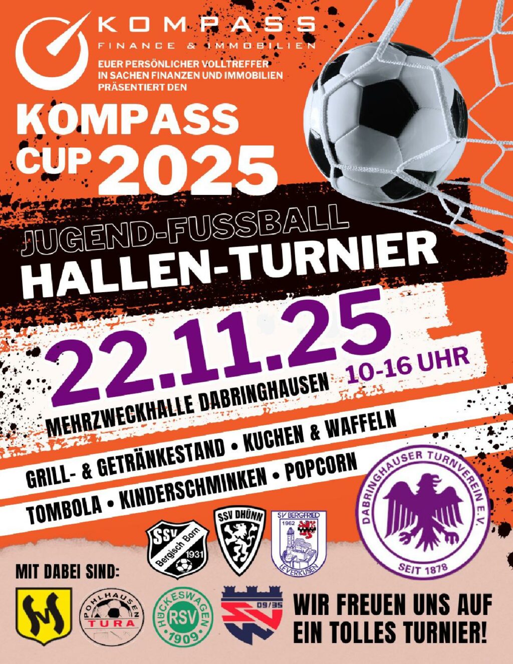 Wermelskirchen - Kompass Cup am 22.11.25 von 11 bis 16 Uhr beim DTV. Erstmalig organisiert der Dabringhauser TV ein Jugendfußball Hallenturnier. Das ganze findet am Samstag, 22.11.25 in der Mehrzweckhalle in Wermelskirchen-Dabringhausen statt. Für das leibliche Wohl ist auch gesorgt: - Grill & Getränkestand - Kuchen & Waffeln - Popcorn - Tombola - Kinderschminken Mannschaften: […]
