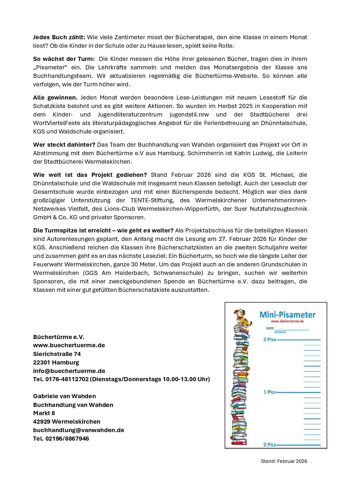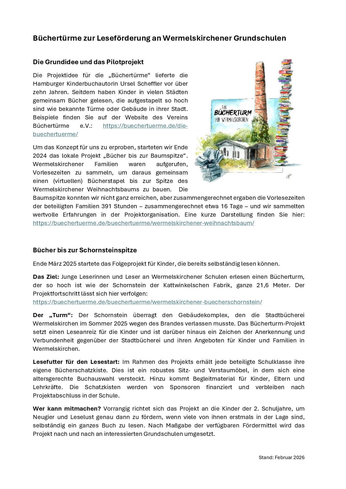 Zum anderen ist das Leseförderungsprojekt „Wermelskirchener Bücherschornstein“ abgeschlossen (https://buechertuerme.de/buechertuerme/wermelskirchener-buecherschornstein/).