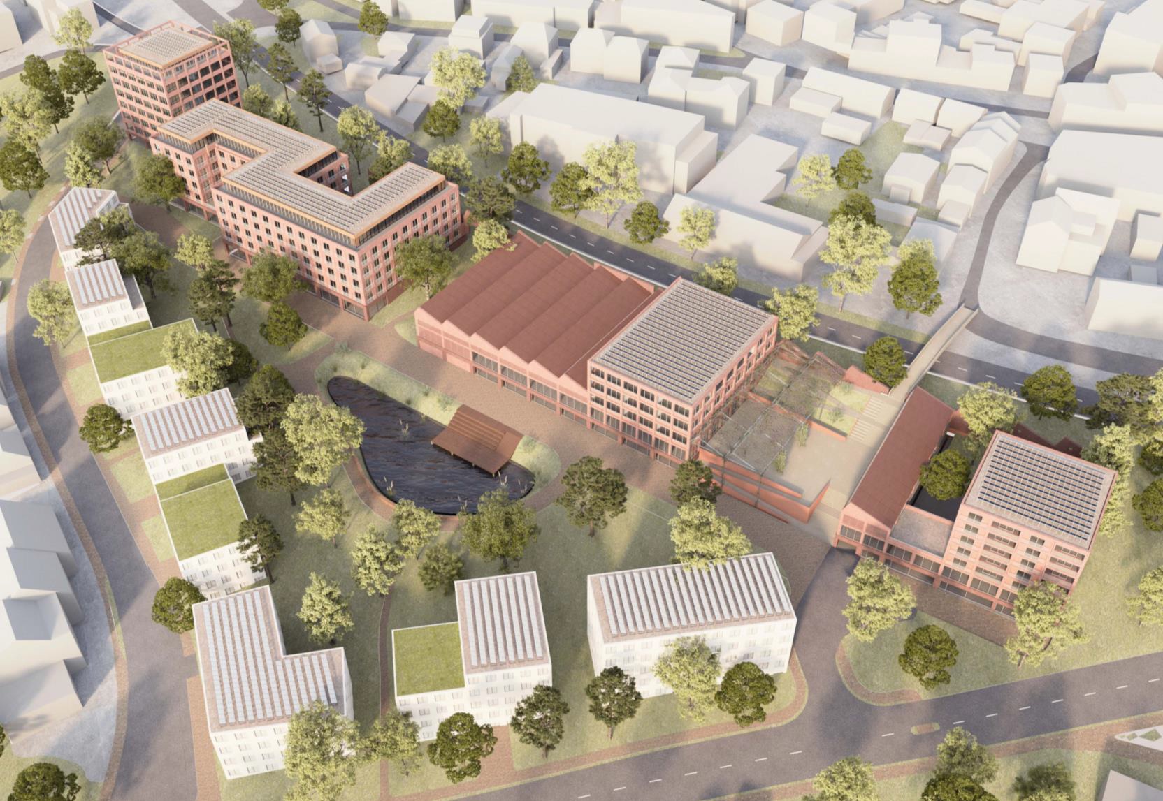 Investitionsschub: Die Stadt investiert 44,3 Millionen Euro in die öffentlichen Vorhaben auf dem Gelände. Durch den Schulterschluss zwischen der Stadt als Eigentümerin eines Teilstücks des Areals mit den Privateigentümern des übrigen Bereichs, der etwa zwei Drittel des Gesamtgeländes umfasst, fließen insgesamt 150 Millionen Euro in die Entwicklung der Rhombus-Brache. Das Invest der öffentlichen Hand sorgt so für einen hohen Nutzen für die Bevölkerung und zieht gleichzeitig ein Mehrfaches an Investitionen nach sich.