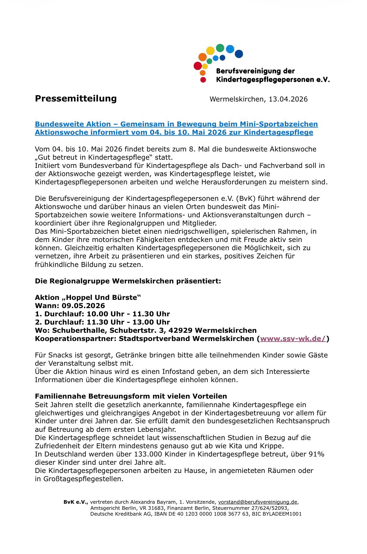 Vom 04.–10. Mai 2026 findet bundesweit die Aktionswoche „Gut betreut in Kindertagespflege“ statt. Ziel ist es, die Bedeutung der Kindertagespflege sichtbar zu machen und über ihre Arbeit zu informieren.